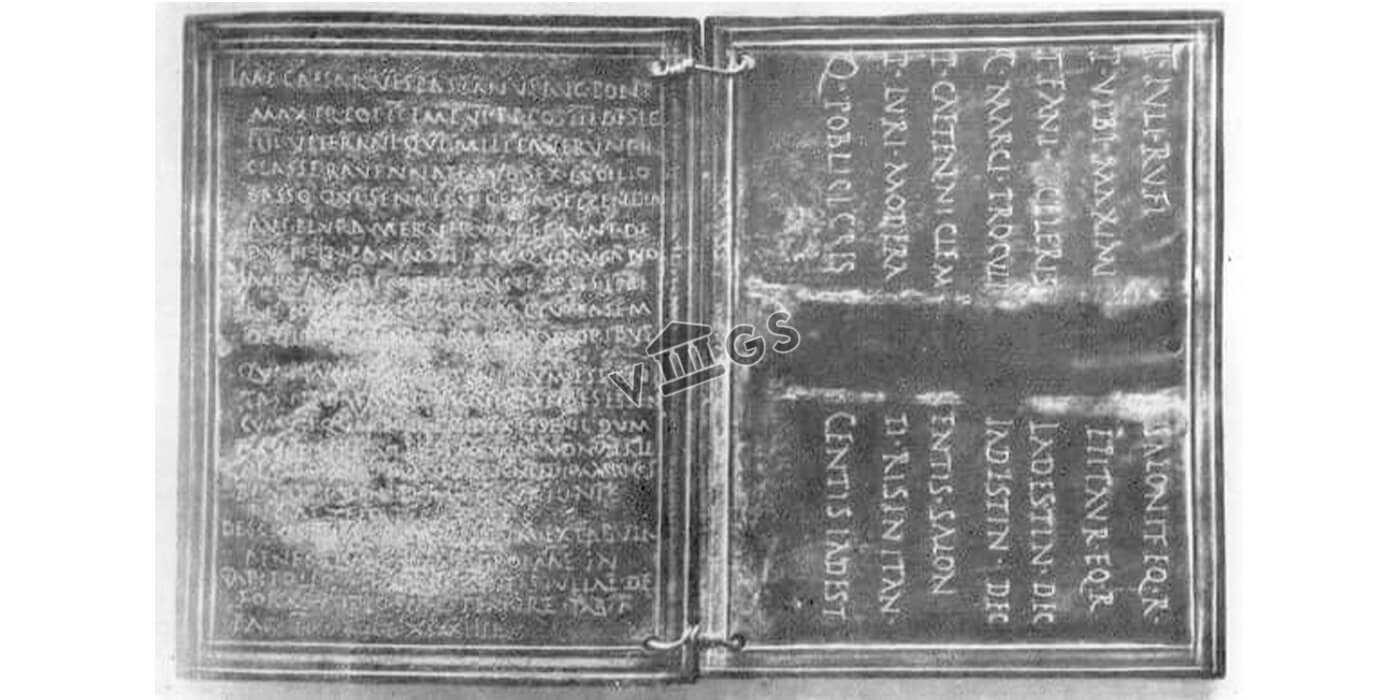 Diploma je sačuvana u cijelosti. Unutarnja tabla I: Imp(erator) Caesar Vespasianus Aug(ustus) pont(ifex) / max(imus) tr(ibunicia) pot(estate) II imp(erator) VI p(ater) p(atriae) co(n)s(ul) III desig(natus) / IIII veteranis qui militaverunt in / classe Ravennate sub Sex(to) Lucilio Basso / qui sena et vicena stipendia aut plura / meruerunt et sunt deducti in Panno/niam quorum nomina subscripta / sunt ipsis liberis posterisque eorum / civitatem dedit et conubium cum Unutarnja tabla II: uxoribus quas tunc habuissent cum / est civitas i(i)s data aut siqui caelibes / essent cum iis quas postea duxissen<t=I> / dumtaxat singuli{s} singulas Non(is) April(ibus) / Caesare Aug(usti) f(ilio) Domitiano Cn(aeo) Pedio Casco co(n)s(ulibus) / Platori Veneti f(ilio) centurioni Maezeio / descriptum et recognitum ex tabula / aenea quae fixa est Romae in Capitolio ad / aram gentis Iuliae de foras podio sinisteriore / tab(ula) I pag(ina) II loc(o) XXXXIIII. Vanjska tabla I: Imp(erator) Caesar Vespasianus Aug(ustus) pont(ifex) / max(imus) tr(ibunicia) pot(estate) II imp(erator) VI p(ater) p(atriae) co(n)s(ul) III desig(natus) / IIII veterani(s) qui militaverunt in / classe Ravennate sub Sex(to) Lucilio / Basso qui sena et vicena stipendia / aut plura meruerunt et sunt de/ducti in Pannoniam quorum no/mina subscripta sunt ipsis libe/ris posterisque eorum civitatem / dedit et conubium cum uxoribus / quas tunc habuissent cum est civi/tas iis data aut siqui caelibes essent / cum iis quas postea duxissent dum/taxat singuli{s} singulas Non(is) April(ibus) / Caesare Aug(usti) f(ilio) Domitiano Cn(aeo) Pedio Casco co(n)s(ulibus) / Platori Veneti f(ilio) centurioni / Maezeio / descriptum et recognitum ex tabula / aenea quae fixa est Romae in / Capitolio ad aram gentis Iuliae de / foras podio sinisteriore tab(ula) I / pag(ina) II loc(o) XXXXIIII Vanjska tabla II: T(iti) Iuli Rufi Salonit(ani) eq(uitis) R(omanis) / P(ubli) Vibi Maximi Epitaur(i) eq(uitis) R(omani) / T(iti) Fani Celeris Iadestin(i) dec(urionis) / C(ai) Marci Proculi Iadestin(i) dec(urionis) / P(ubli) Caetenni Clementis Salon(itani) / P(ubli) Luri Moderati Risinitan(i) / Q(uinti) Poblici Crescentis Iadest(ini) Vanjska tabla I (prijevod): Imperator Cezar Vespazijan August, vrhovni svećenik s tribunskom čašću drugi put, imperator šesti put, otac domovine, konzul treći put, (konzul) izabrani četvrti put, veteranima koji su vojevali u ravenatskom brodovlju pod Sekstom Lucilijem Basom, koji su odslužili 25 i više godina, i koji su naseljeni u Panoniji i čija su imena dolje napisana, njima, djeci i potomcima njihovim daje civitet i pravo zakonitog braka sa suprugama koje su tada imali, kad im je civitet dan, ili, ako su koji bili neoženjeni, s onima, koje su poslije doveli, naravno pojedini s pojedinom. Peti dan aprila tijekom konzulovanja Cezara Domicijana, Augustova sina, i Gneja Pedija Kaska. Centurionu Platoru, Venetovu sinu, Mezeju. Prepisano i provjereno s mjedene ploče koja je pričvršćena u Rimu na Kapitoliju kod žrtvenika Julijevskog roda, s vanjske strane krajnjeg lijevog podija, na I. ploči, II. stupcu, XXXXIIII. retku. Vanjska tabla II (prijevod): (pečat) Tita Julija Rufa, Salonitanca viteza, (pečat) Publija Vibija Maksima, Epidaurana viteza, (pečat) Tita Fanija Celera, Jadestina gradskog vijećnika, (pečat) Gaja Marcija Prokula Jadestina gradskog vijećnika, (pečat) Publija Cetenija Klementa, Salonitanca, (pečat) Publija Lurija Moderata, Rizinitana, (pečat) Kvinta Poblicija Krescentija, Jadestina.